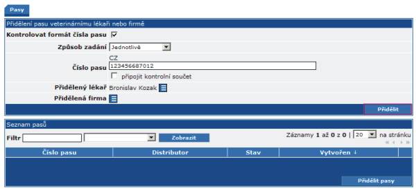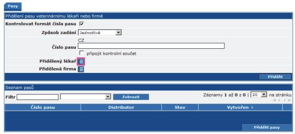Klikněte na ikonku "Vybrat" Okno se samo zavře a vrátí vás zpět na zadání pasu, ale již máte dosazeného lékaře / firmu. 6 krok - přidělit nový pas / pasy Klikněte na ikonku "Přidělit"